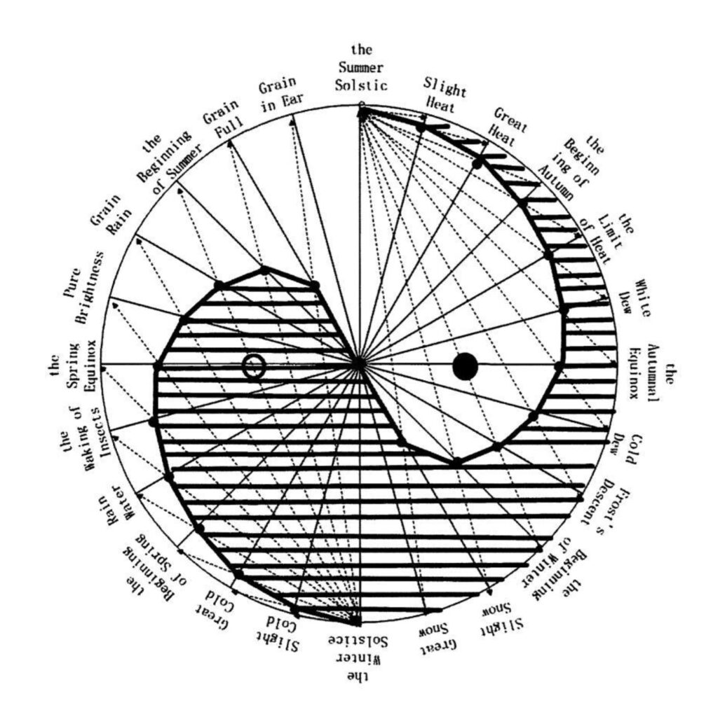 Here is a rendering from David’s late Acupuncture Master, Dr. Bear, showing the relationship of the 24 Qi Nodes and how much Yin (cold) and Yang (warmth) exists at each note, in relationship to the angle of the sun as it strikes the Earth.